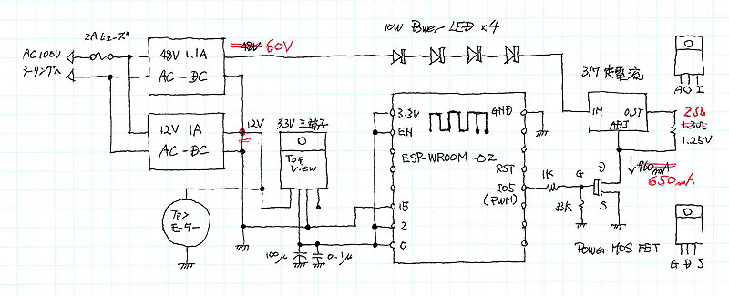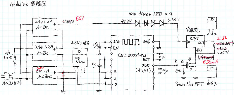 さて、このパワーLEDの定格電圧は15V、 4個をシリーズ接続するので必要電圧は60V以上となり、 従来の回路の48Vでは電圧が足りません。 そこで Arduino 用の電源を供給している12VのAC-DCでゲタを履かせて60Vとします。 また定格電流値が異なるので定電流源の抵抗値も変更します。 具体的には以下の回路となります。