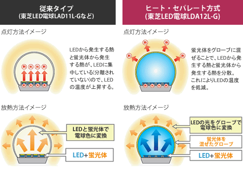 蛇足ながら、カバーがないと発光色が青いことについてですが、 下記の東芝の説明の通り、 オレンジのカバーに蛍光体が混ざっていてそこからも発光させているからのようです。 蛍光灯みたいですね。
