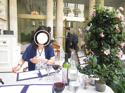 ランチはホテルの中庭のレストランで。 午後1時過ぎ、気持ちのいい風が吹いていた。 見上げれば青空。斬新なフランス料理。幸せなランチタイムだ。