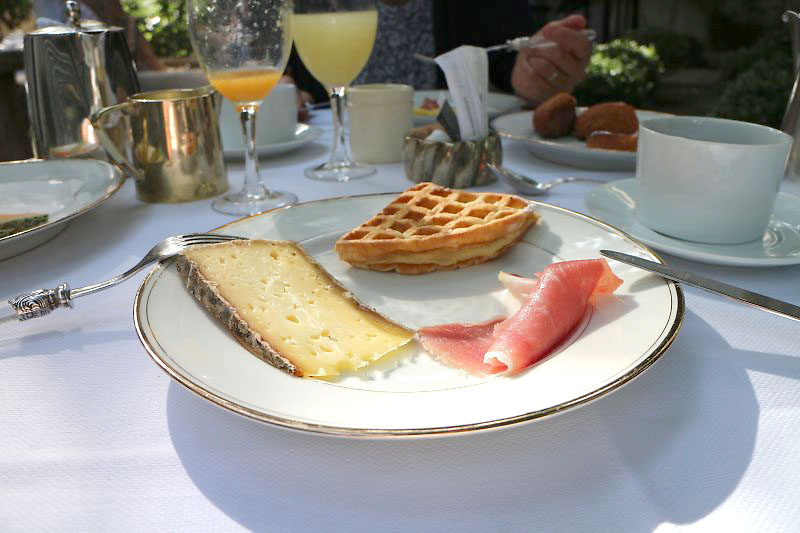 朝8時半に朝食へ。 テラス席の最前列のテーブル。 ノートルダム寺院が朝日に輝いている。 きれいな風景だ。 丁寧で美味しい朝食だった。